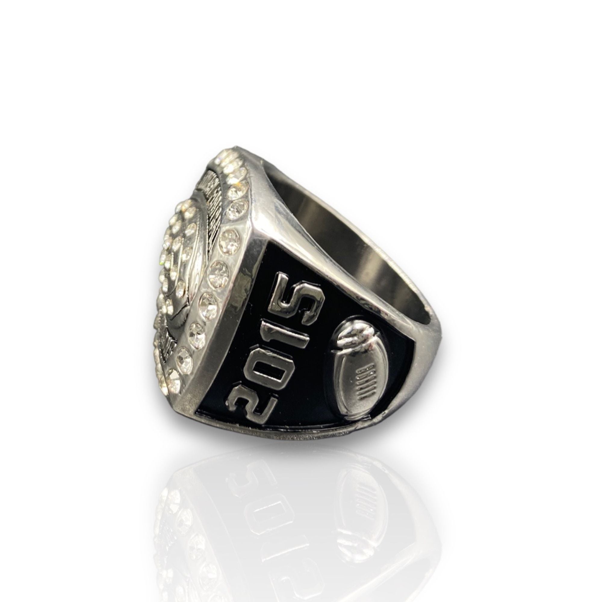 Fantasy Football Championship Ring 2015 in the design of an American Football. Scattered rhinestones give the ring an elegant appearance. The solid metal alloy makes the Fantasy Football Ring the fitting accessory for accomplished Fantasy Football champions. The ideal ring for all winners of the Fantasy Football season in 2015.