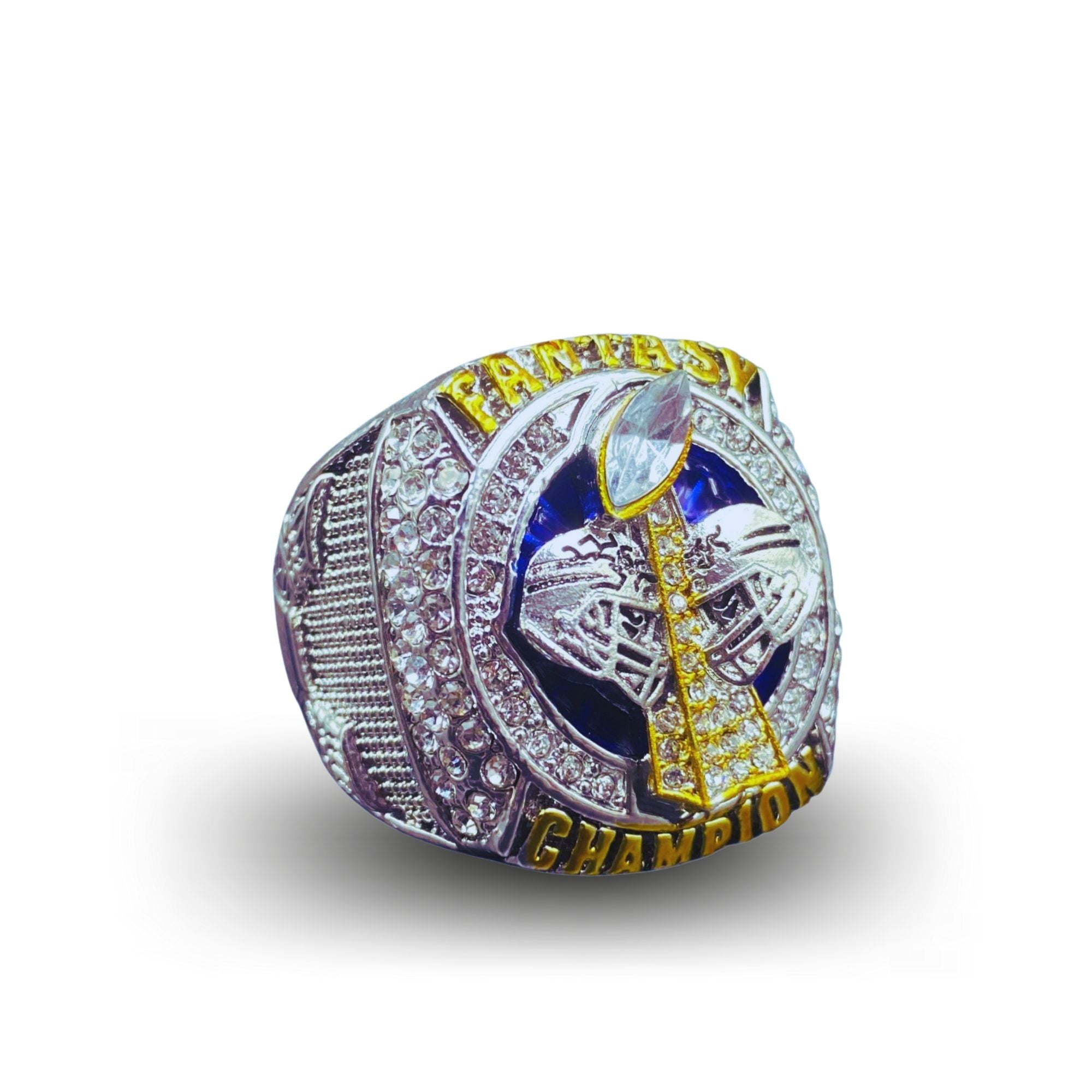 2022 Fantasy Football Championship Ring for the Fantasy Football Season that started in September 2022. Featuring a prominent trophy that collides with two American Football helmets, this ring symbolizes the enduring victory of the Fantasy Football season 2022. Crafted from solid metal alloy, it's a weighty testament reserved for seasoned Fantasy Football champions.
